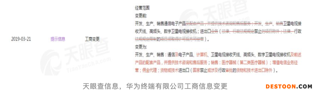 2019年3月末,華為變更公司經(jīng)營范圍,新增醫(yī)療器械銷售等業(yè)務(wù)。華為終端有限公司變更公司經(jīng)營范圍,新增了醫(yī)療器械(第二類醫(yī)療器械)銷售等業(yè)務(wù)。
