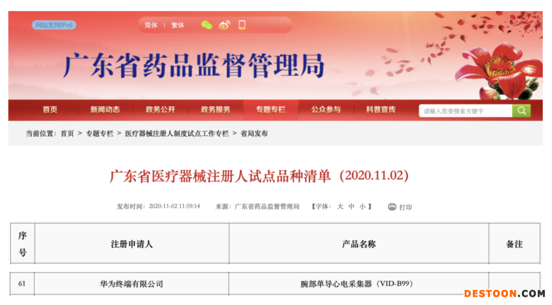 11月2日,廣東省藥監(jiān)局發(fā)布《廣東省醫(yī)療器械注冊人試點(diǎn)品種清單》,在品種清單中的第61項(xiàng),華為終端有限公司作為申請注冊人,申請了醫(yī)療器械--腕部單導(dǎo)心電采集器(VID-B99)。