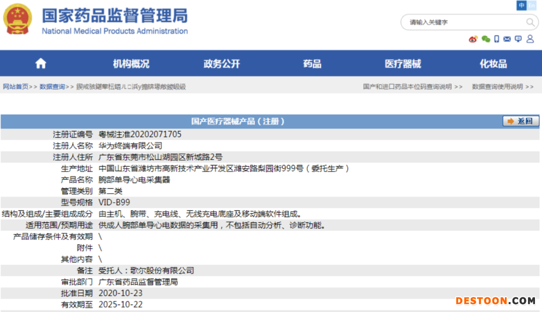 據(jù)賽柏藍(lán)器械在國家藥監(jiān)局查詢,該產(chǎn)品注冊編號為粵械注冊20202071705,注冊人為華為終端有限公司,產(chǎn)品管理類為第二類,適用的范圍或預(yù)期用途:供成人腕部單導(dǎo)心電數(shù)據(jù)的采集用。