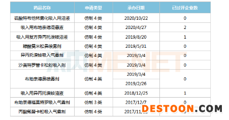 在審的10個吸入劑中,有7個品種暫未有企業(yè)通過或視同通過一致性評價,其中沙美特羅替卡松粉吸入劑、布地奈德福莫特羅吸入氣霧劑、丙酸氟替卡松吸入氣霧劑3個品種目前僅原研產品在售,暫未有仿制藥獲批上市。