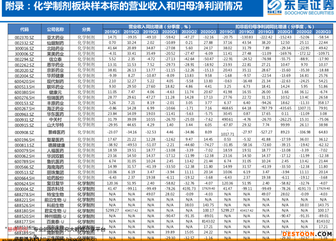 具體看化藥制劑企業(yè),2020Q1-3營業(yè)收入總額增長-2.7%,扣非后歸母凈利潤總額增長-0.7%。其中,2020Q3營業(yè)收入總額增長4.8%,扣非后歸母凈利潤總額增長17.8%,較2020Q2顯著回升。