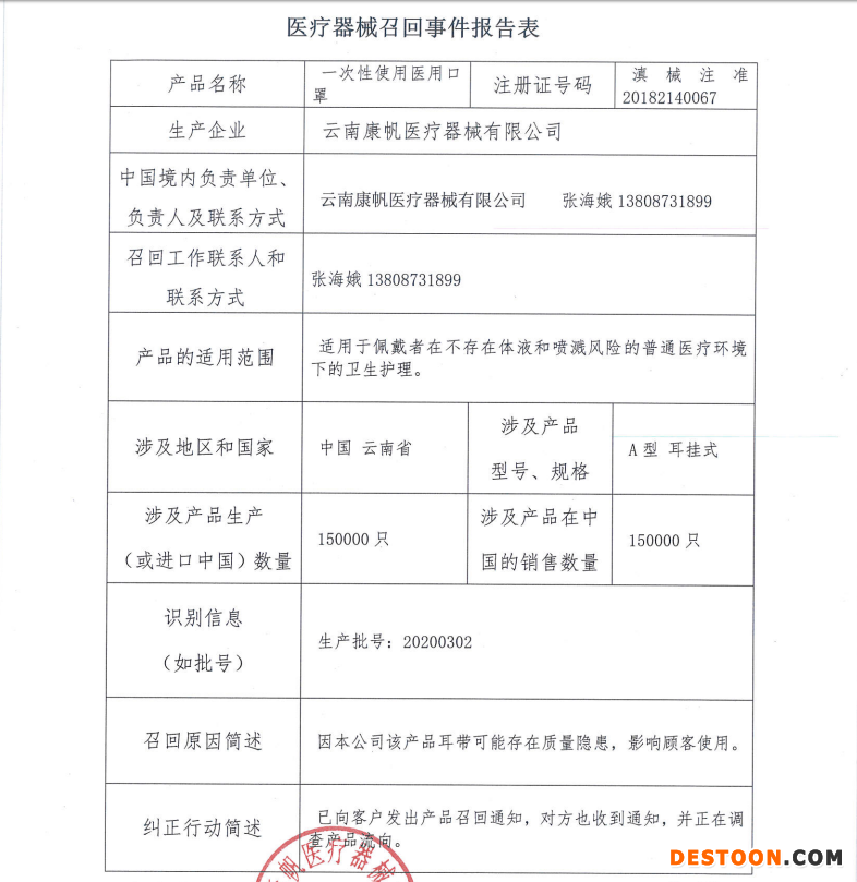 公告指出:由于云南康帆醫(yī)療器械有限公司生產(chǎn)的一次性使用醫(yī)用口罩(生產(chǎn)批號:20200302)因耳帶可能存在質(zhì)量隱患,影響使用。