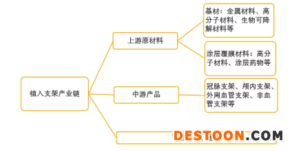 植入支架產業(yè)鏈可分為產業(yè)鏈上游原材料、儀器設備,中游的植入支架產品和下游應用端的醫(yī)院