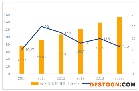 冠脈支架是植入支架最重要的細分領域,占據了我國植入支架市場過半份額。最新發(fā)布的《中國心血管病健康和疾病報告2019》顯示,2018年國內PCI治療例數91.53萬,按人均支架使用量1.5個計算,支架使用量在137萬個,2019年全國使用冠脈支架數量在150萬枚以上。