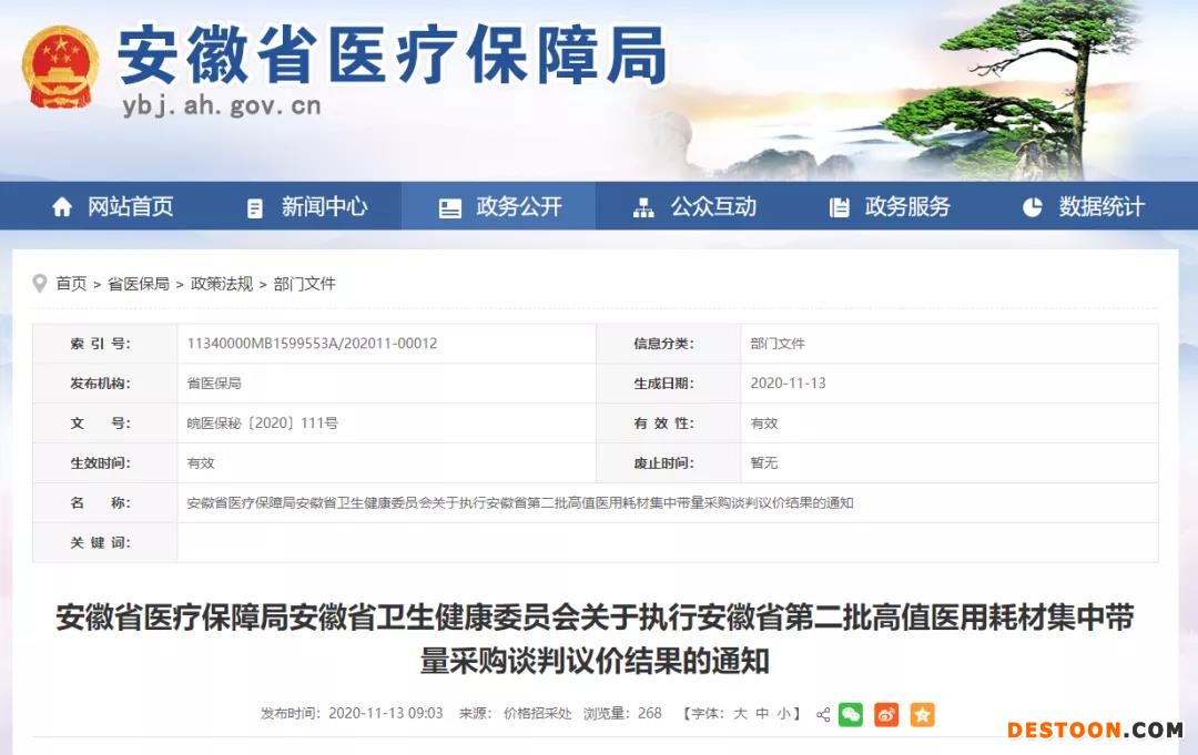 11月13日,安徽省醫(yī)保局發(fā)布《安徽省醫(yī)療保障局安徽省衛(wèi)生健康委員會關(guān)于執(zhí)行安徽省第二批高值醫(yī)用耗材集中帶量采購談判議價結(jié)果的通知》。