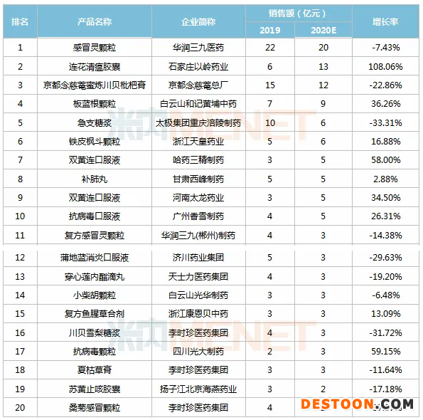 從增長率看,20個產(chǎn)品中有10個同比去年呈正增長,連花清瘟膠囊(感冒用藥)、板藍(lán)根顆粒(清熱解毒用藥)、雙黃連口服液(感冒用藥)、抗病毒口服液(感冒用藥)、復(fù)方板藍(lán)根顆粒(清熱解毒用藥)增速超過30%,其中連花清瘟膠囊大漲超100%。