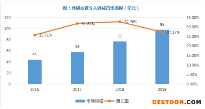 目前外周動(dòng)脈心血管介入在國(guó)內(nèi)仍處于發(fā)展初期,2019年我國(guó)外周血管介入器械市場(chǎng)規(guī)模達(dá)到98億元,增長(zhǎng)率高達(dá)27.27%。
