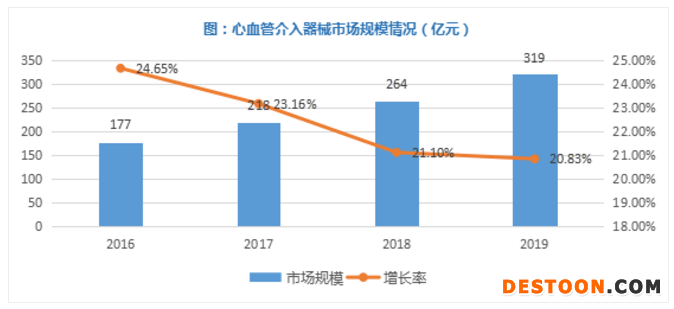 隨著心血管患者對(duì)介入治療需求的增加,心血管介入領(lǐng)域的器械市場(chǎng)迎來(lái)快速增長(zhǎng),據(jù)Eshare醫(yī)械匯測(cè)算,2019年心血管介入器械市場(chǎng)規(guī)模約為319億元。但受限于帶量采購(gòu)、醫(yī)??刭M(fèi)等政策影響,心血管介入市場(chǎng)的增速將逐年趨緩。