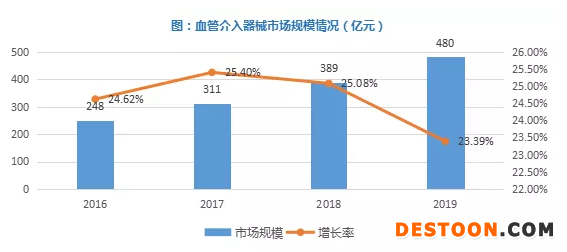 盡管中國(guó)血管介入器械行業(yè)起步較晚,但在政策與市場(chǎng)因素驅(qū)動(dòng)下,發(fā)展速度較快。據(jù)Eshare醫(yī)械匯測(cè)算,2019年血管介入器械市場(chǎng)規(guī)模約為480億元,同比增長(zhǎng)23.39%。