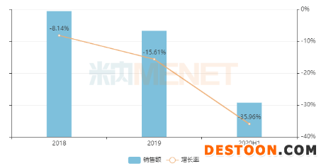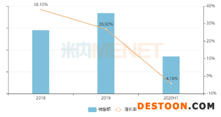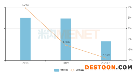 目前市場上的泮托拉唑注射劑主要為注射用泮托拉唑鈉,適用于十二指腸潰瘍、胃潰瘍、急性胃粘膜病變,復合性胃潰瘍等急性上消化道出血。該產(chǎn)品在中國公立醫(yī)療機構(gòu)終端銷售額峰值出現(xiàn)在2016年,接近88億元,2019年回落至67億元,2020上半年領(lǐng)軍企業(yè)揚子江藥業(yè)集團市場份額達28.07%,南京正大天晴制藥份額不到1%。