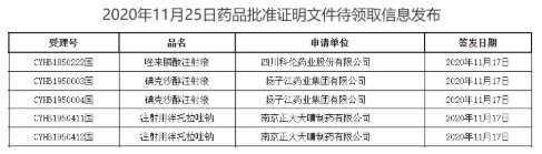 核心提示:11月25日,NMPA官網(wǎng)更新了最新獲批藥品信息,四川科倫藥業(yè)的唑來膦酸注射液、揚子江藥業(yè)集團的碘克沙醇注射液、南京正大天晴制藥