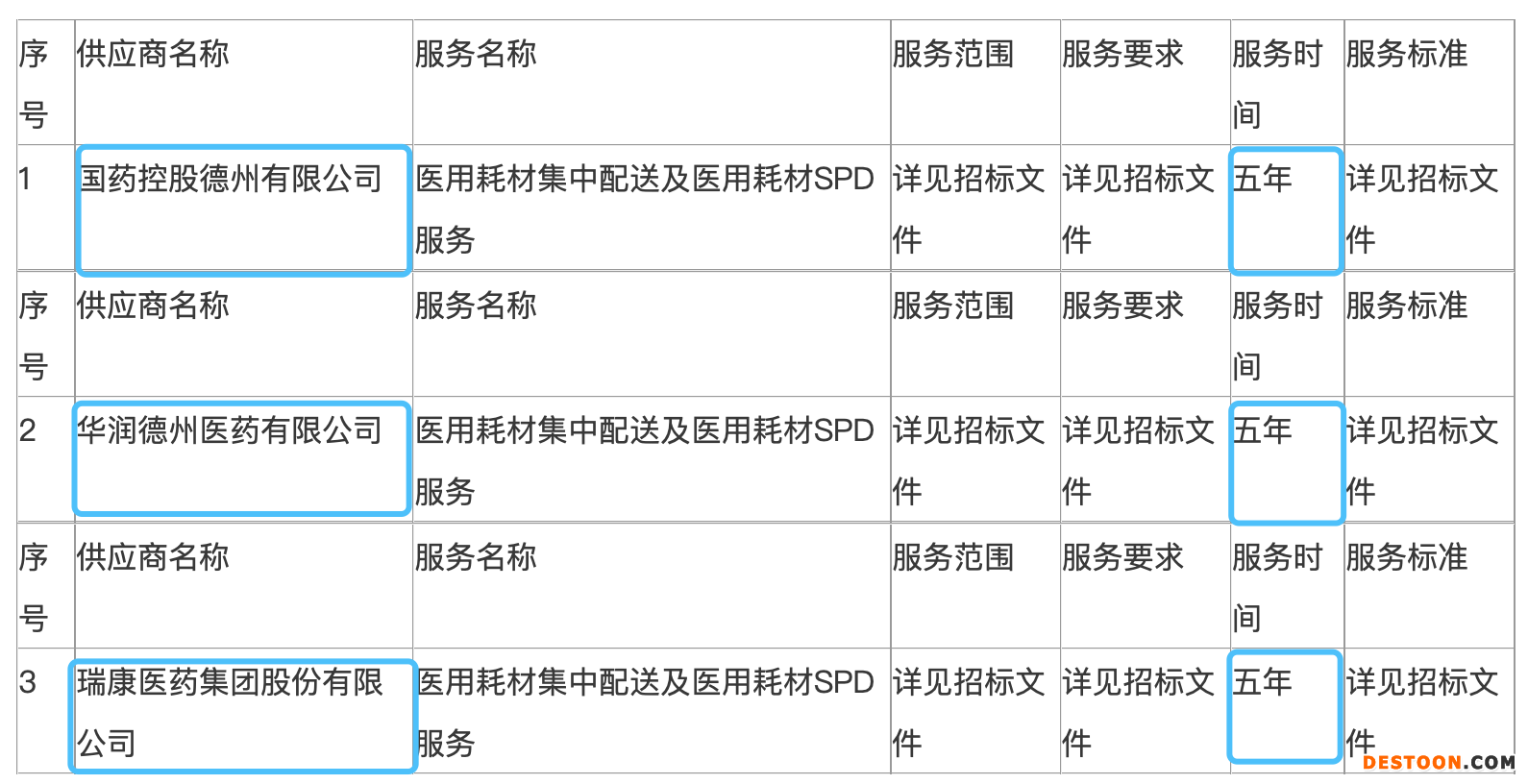 文件指出,平原縣第一人民醫(yī)院的年度耗材、試劑采購預(yù)算金額為4000萬元,服務(wù)周期為5年,總金額為2億。國藥控股德州有限公司、華潤德州醫(yī)藥有限公司、瑞康醫(yī)藥集團(tuán)股份有限公司3家企業(yè)中標(biāo)。