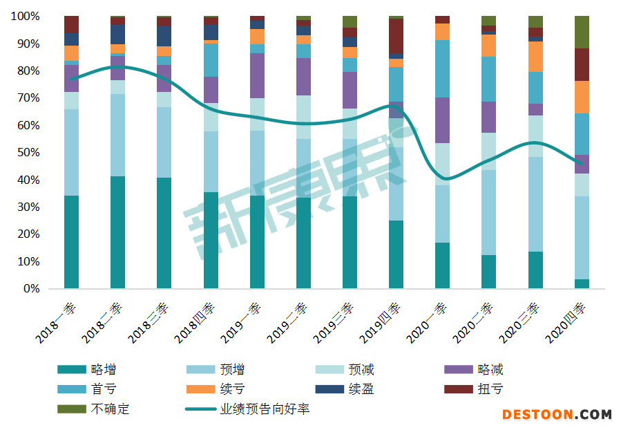 圖5 2018-2020年各季度財(cái)報(bào)業(yè)績(jī)預(yù)告情況及向好率變化情況(業(yè)績(jī)預(yù)告向好包括預(yù)增、略增、續(xù)盈及扭虧這四種情況)