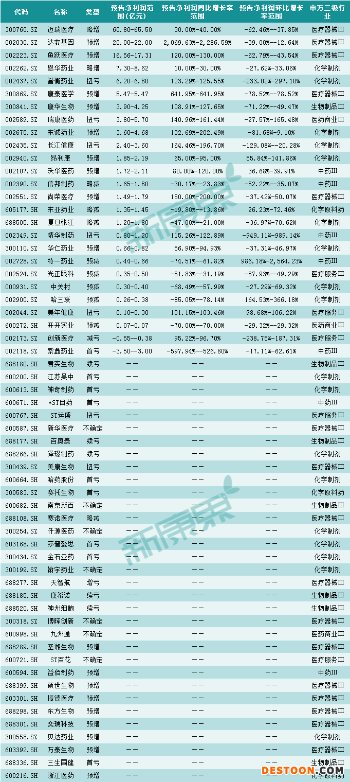 從預(yù)告凈利潤(rùn)同比增長(zhǎng)平均值看,達(dá)安基因、康泰醫(yī)學(xué)及長(zhǎng)江健康位列漲幅前三。其中,前兩者均是醫(yī)療器械領(lǐng)域的預(yù)增企業(yè),而后者則屬于化學(xué)制劑的扭虧企業(yè)(原因是公司上年度業(yè)績(jī)受商譽(yù)減值影響大幅虧損)。至于跌幅最大的,則是前面提到的首虧企業(yè)紫鑫藥業(yè),預(yù)告凈利潤(rùn)同比下降562%。