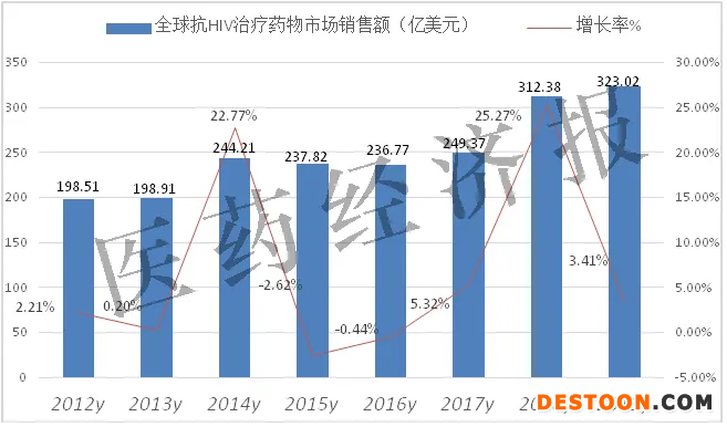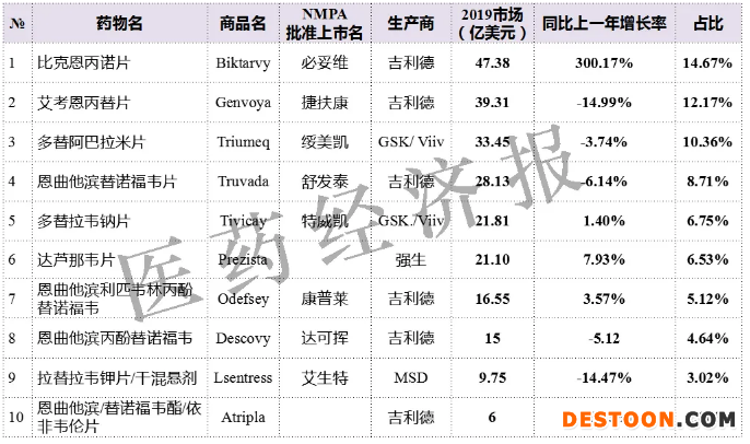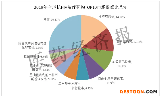 據(jù)跨國公司財報,2019年全球抗HIV藥物終端市場為323億美元,同比上一年增長率為3.41%。其中抗HIV藥物TOP10占據(jù)了該領(lǐng)域70%以上的市場。