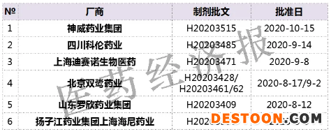 迄今NMPA批準(zhǔn)國內(nèi)17家企業(yè)的替諾福韋二吡呋酯片上市,并進(jìn)入中國上市藥品目錄集,通過一致性評價。2020年NMPA批準(zhǔn)生產(chǎn)替諾福韋二吡呋酯片的企業(yè)有神威藥業(yè)、四川科倫、上海迪賽諾、北京雙鷺、北京雙鷺和揚(yáng)子江上海海尼等6家,通過一致性評價。