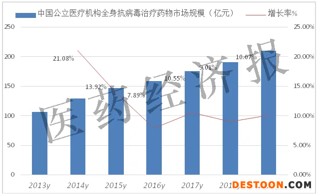 圖3 2013-2019年中國公立醫(yī)療機(jī)構(gòu)全身抗病毒藥物市場情況