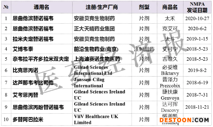 國家藥監(jiān)局官網(wǎng)數(shù)據(jù)顯示,目前有注冊生產(chǎn)批文的抗HIV單方藥及復(fù)方制劑有30個。2017年-2020年11月NMPA批準(zhǔn)了10家公司注冊生產(chǎn)的9個抗HIV治療復(fù)方藥物和長效創(chuàng)新藥物。國家創(chuàng)新Ⅰ類抗HIV新藥艾博韋泰注射用藥由前沿生物藥業(yè)(南京)上市,商品名為艾可寧。