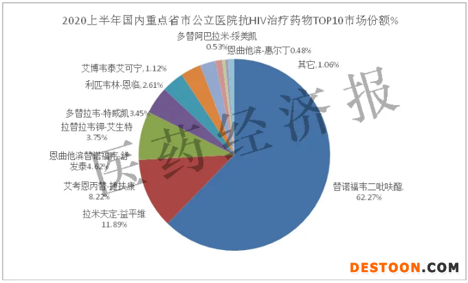 圖4 2020上半年國內(nèi)重點(diǎn)省市公立醫(yī)院抗HIV藥物TOP10份額占比