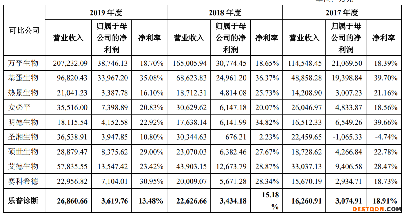 據(jù)梳理,國內(nèi)體外診斷企業(yè)目前包括萬孚生物、基蛋生物、熱景生物、安必平、明德生物等企業(yè),與同行業(yè)可比公司相比,樂普診斷2019年度發(fā)行人營業(yè)收入高于熱景生物、明德生物和賽科希德,凈利潤處于相對(duì)較低水平。
