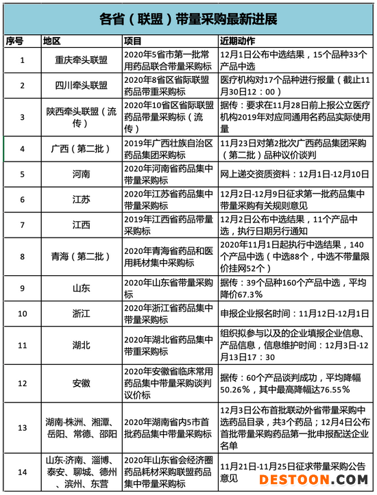 業(yè)界另一關(guān)注點則落在各地區(qū)下一步藥品帶量采購的考量上。2019年11月,國務(wù)院深化醫(yī)藥衛(wèi)生體制改革領(lǐng)導(dǎo)小組在《關(guān)于以藥品集中采購和使用為突破口進一步深化醫(yī)藥衛(wèi)生體制改革若干政策措施的通知》中提出,對未納入國家組織集中采購和使用范圍的藥品,各地要依托省級藥品集中采購平臺,借鑒國家組織藥品集中采購和使用經(jīng)驗,采取單獨或跨區(qū)域聯(lián)盟等方式,在采購藥品范圍、入圍標(biāo)準、集中采購形式等方面加大改革創(chuàng)新力度,并鼓勵探索采取集團采購、???strong>醫(yī)院聯(lián)合采購、醫(yī)療聯(lián)合體采購等方式形成合理價格。