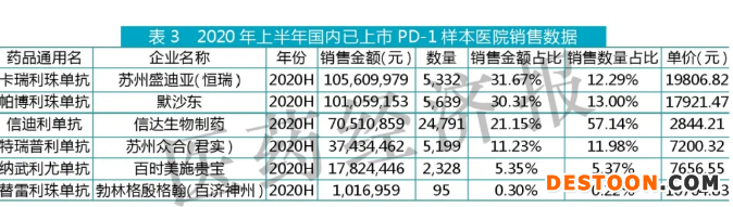 最終,信達(dá)的信迪利單抗納入醫(yī)保,而國(guó)產(chǎn)首個(gè)上市的君實(shí)的特瑞普利單抗未能進(jìn)入醫(yī)保。前者在進(jìn)入醫(yī)保前,售價(jià)為7838元/100mg,進(jìn)入醫(yī)保后價(jià)格降至2843元/100mg,降價(jià)幅度達(dá)64%。以70%的報(bào)銷比例計(jì)算,病人實(shí)際僅需自付852元/100mg。從2020年上半年銷售數(shù)據(jù)來(lái)看,前者的銷售量是后者的約5倍,銷售額接近1倍。