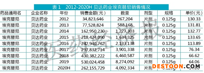 數(shù)據(jù)顯示,貝達(dá)藥業(yè)的埃克替尼樣本醫(yī)院銷售價(jià)格從133元左右降至76元,降幅達(dá)43%,帶來(lái)的是銷售量大幅上升,2019年銷售量接近2016年的4倍,銷售額也增長(zhǎng)了1倍多。