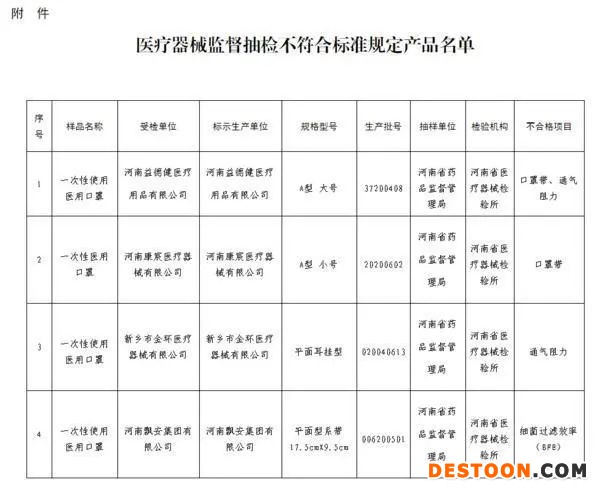 1.河南益德健醫(yī)療用品有限公司生產(chǎn)的1批次一次性使用醫(yī)用口罩,規(guī)格型號(hào):A型大號(hào),生產(chǎn)日期:2020年4月8日,生產(chǎn)批號(hào):37200408,不合格項(xiàng)目:口罩帶、通氣阻力。