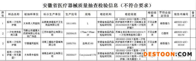 其中,在太和縣人民醫(yī)院抽樣的,標(biāo)示為合肥美迪普醫(yī)療衛(wèi)生用品有限公司生產(chǎn)的醫(yī)用一次性防護(hù)服,生產(chǎn)批號(hào)18111601,規(guī)格L;寧國(guó)健民醫(yī)院抽樣的,標(biāo)示為河南三耀醫(yī)療器械有限公司生產(chǎn)的醫(yī)用一次性防護(hù)服,生產(chǎn)批號(hào)20052701,規(guī)格連身式180;太和縣中醫(yī)院抽樣的,標(biāo)示為湖南迅卓實(shí)業(yè)有限公司生產(chǎn)的醫(yī)用一次性防護(hù)服(非無(wú)菌型),生產(chǎn)批號(hào)20200417,規(guī)格Conjoined/170;均斷裂強(qiáng)力不符合要求。