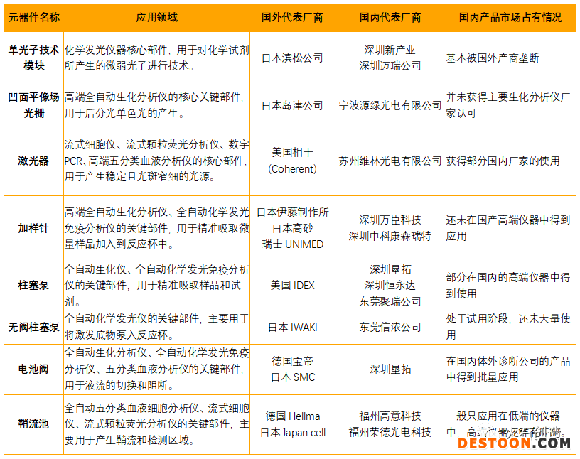 IVD儀器領(lǐng)域被關(guān)注的程度不如試劑原材料那么高,主要由于比較成熟的領(lǐng)域(如生化試劑領(lǐng)域),儀器基本處于開放狀態(tài),國產(chǎn)廠家的試劑只要去適配市面上現(xiàn)有的儀器即可,而高端的體外診斷設(shè)備和試劑基本上是一體化的封閉體系,這就會(huì)導(dǎo)致各個(gè)廠家的儀器都是非標(biāo)準(zhǔn)化的設(shè)計(jì),沒有較為統(tǒng)一的標(biāo)準(zhǔn)。此外,由于IVD的儀器是多學(xué)科交叉的領(lǐng)域,整合了高速自動(dòng)化、精密光學(xué)、非標(biāo)結(jié)構(gòu)、集成電路、流體力學(xué)和生物學(xué)等多種學(xué)科,同時(shí)體外診斷儀器開發(fā)的人員在初始階段幾乎都是從其他電子儀器行業(yè)轉(zhuǎn)行過來的,對于診斷儀器這種多學(xué)科交叉的儀器開發(fā)訓(xùn)練不夠系統(tǒng),對于相關(guān)的法律法規(guī)也不夠熟悉,因此只有幾個(gè)頭部的企業(yè)才有實(shí)力去開發(fā)與試劑相應(yīng)的大型配套儀器,中小廠家的IVD儀器開發(fā)主要分布在小型或自動(dòng)化程度較低的POCT儀器上為多。該領(lǐng)域國內(nèi)比較缺乏的核心元器件如表2所示,目前國內(nèi)核心元器件生產(chǎn)能力缺乏的原因主要還是加工的工藝達(dá)不到足夠的精度造成的。