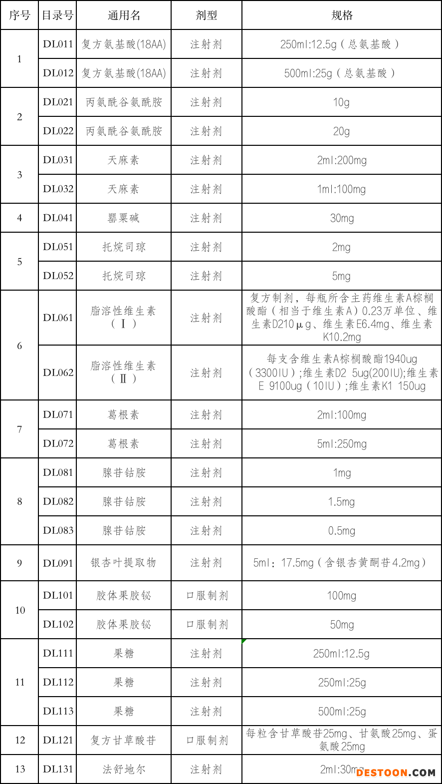 而此次正式公布的文件中,15個品種減至13個,絕大多數(shù)為注射劑品種,13個品種分別是復(fù)方氨基酸(18AA)、丙氨酰谷氨酰胺、天/麻/素、罌/粟/堿、托烷司瓊、脂溶性維生素(Ⅰ)、葛根素、腺苷鈷胺、銀杏葉提取物、膠體果膠鉍、果糖、復(fù)方甘草酸苷、法舒地爾。