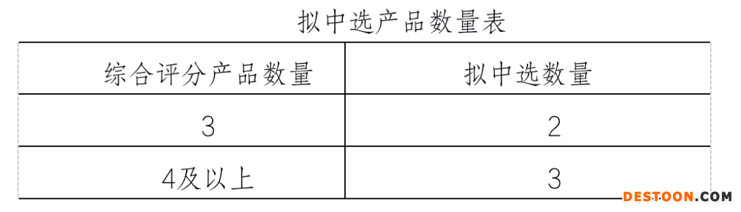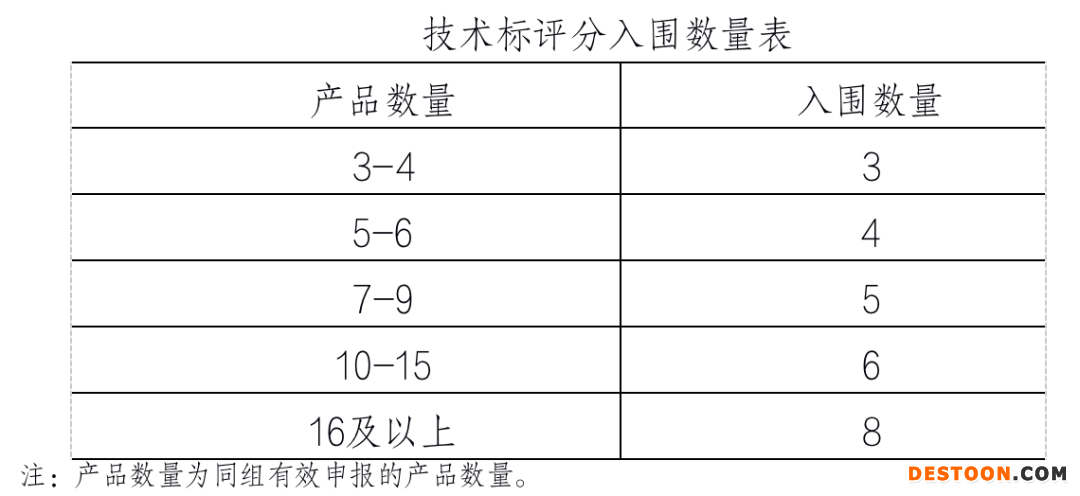同一目錄,申報企業(yè)數(shù)量大于或等于3家的,將“技術(shù)標(biāo)評分”得分由高到低排序,按照“技術(shù)標(biāo)評分入圍數(shù)量表”的相應(yīng)數(shù)量,依次確定進(jìn)入綜合評分環(huán)節(jié)的產(chǎn)品(若最后一名得分相同時,均進(jìn)入綜合評審環(huán)節(jié))。