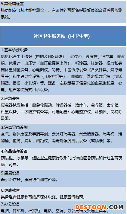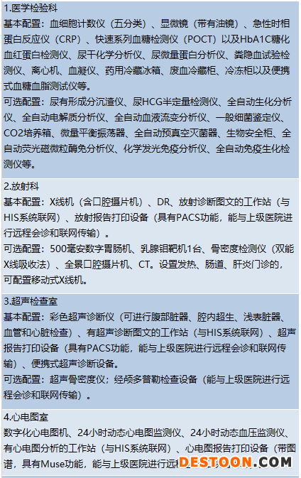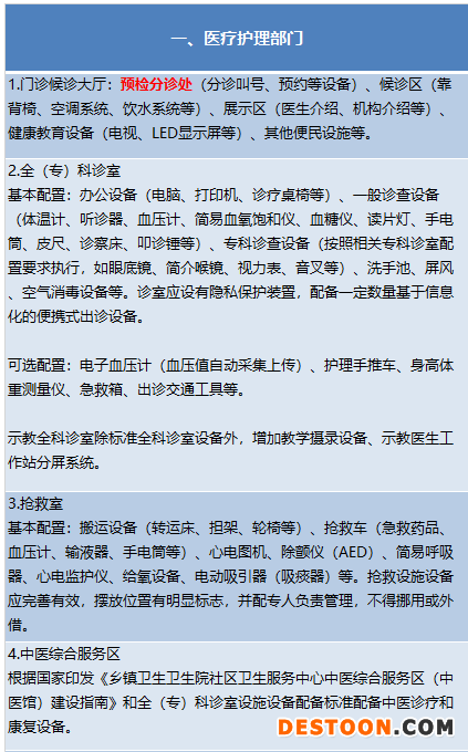 全國鄉(xiāng)鎮(zhèn)衛(wèi)生院和社區(qū)衛(wèi)生服務中心還需要配備下述圖中90%以上的基本醫(yī)療設備,并配備6種以上的中醫(yī)診療設備和康復設備,以及要擁有 DR、彩超、全自動生化分析儀、血凝儀、十二導聯(lián)心電圖機、空氣消毒機、麻醉機、胃鏡、呼吸機以及 CT、急救型救護車、全自動化學發(fā)光免疫分析儀等設備等。