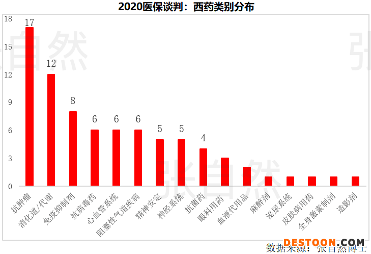 本次談判,納入的腫瘤藥最多,達17個,位居其后的依次是,消化/代謝12個、免疫抑制劑8個和抗病毒藥6個,這與2018年4月以來國家對抗癌藥從進口、審評審批及臨床使用等的系列支持是分不開的,本次談判競爭最激烈的也是抗癌藥,如PD-1等。
