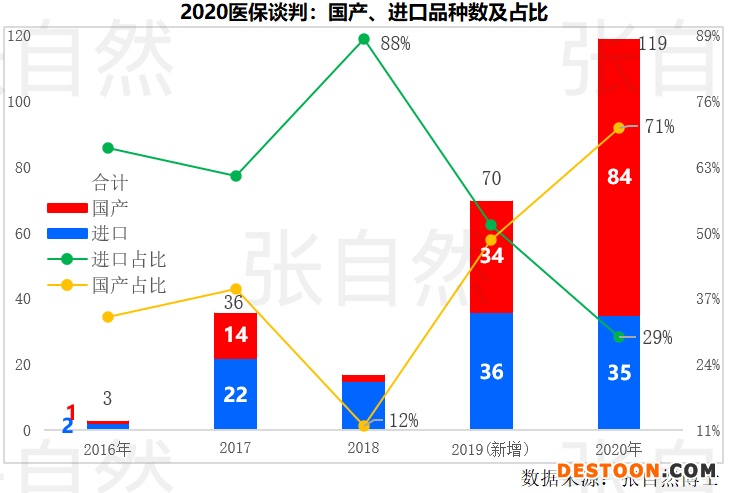 在談判成功的119個品種中,國產(chǎn)和進口品種分別為84個和35個,各占71%和29%,而2019年談判成功的70個品種中,國產(chǎn)的只有34個,僅占49%,再往前的幾次談判,國產(chǎn)品種占比都不高,可見,近年我國醫(yī)藥創(chuàng)新取得了明顯的進展,我國正處在醫(yī)藥創(chuàng)新的黃金時期,隨著更多國產(chǎn)創(chuàng)新藥的上市,今后談判將會有更多民族品牌亮相。