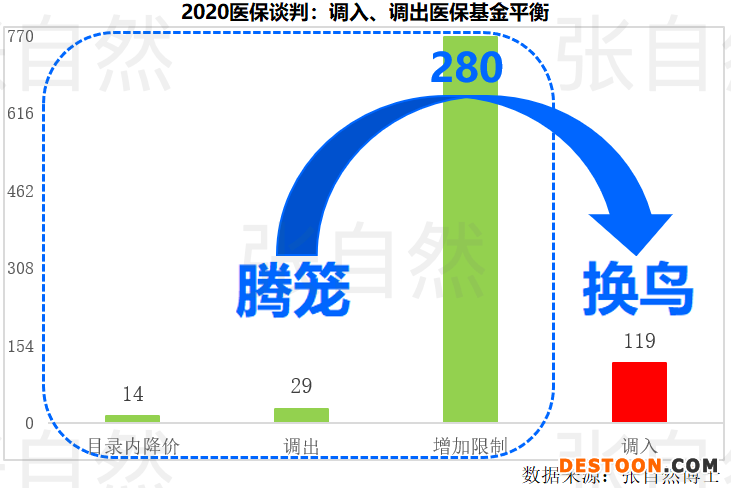 同時,調(diào)出29個品種、對目錄內(nèi)14個品種降價(降幅43.46%)、并對760多個品種進行了醫(yī)保支付限制,大概騰出醫(yī)?;鹨彩?80多億元,基本實現(xiàn)了進出平衡,在不額外增加醫(yī)?;鹭摀?dān)的情況下,通過調(diào)整醫(yī)保品種結(jié)構(gòu),滿足了更多尚未滿足的臨床需求,真正實現(xiàn)了騰籠換鳥。