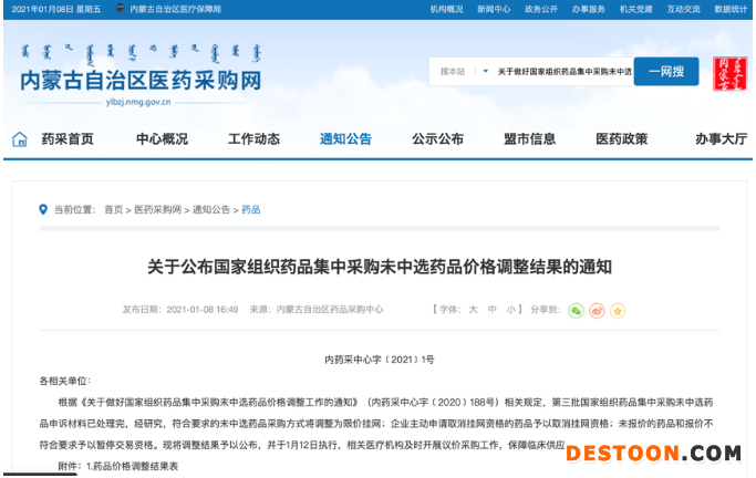 核心提示:  1月11日訊 1月8日,內(nèi)蒙古自治區(qū)醫(yī)藥采購網(wǎng)發(fā)布《關(guān)于公布國家組織藥品集中采購未中選藥品價格調(diào)整結(jié)果的通知》。梳理附件