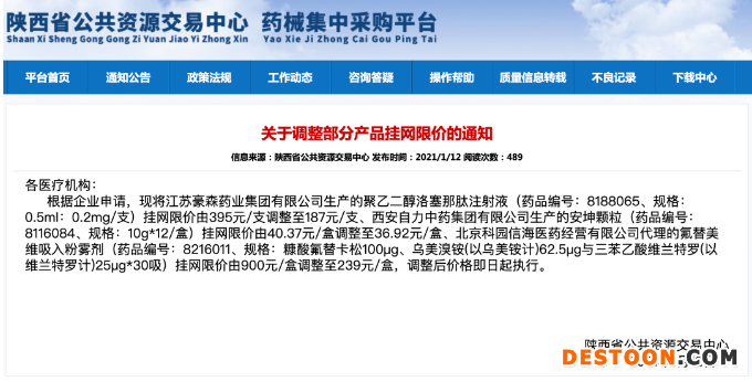 1月13日訊 1月12日,陜西省公共資源交易中心發(fā)布關(guān)于調(diào)整部分產(chǎn)品掛網(wǎng)限價(jià)的通知,根據(jù)企業(yè)申請(qǐng),江蘇豪森的聚乙二醇洛塞那肽注射液(規(guī)格:0.5ml:0.2mg/支)掛網(wǎng)限價(jià)由395元/支調(diào)整至187元/支、北京科園信海醫(yī)藥經(jīng)營(yíng)有限公司代理的氟替美維吸入粉霧劑掛網(wǎng)限價(jià)由900元/盒調(diào)整至239元/盒。