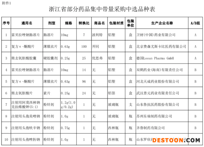 2020年12月9日,浙江省藥械采購(gòu)中心發(fā)布《浙江省部分藥品集中帶量采購(gòu)工作方案》,宣布對(duì)雷貝拉唑口服常釋劑型、熊去氧膽酸口服常釋劑型、阿莫西林克拉維酸注射劑、亮丙瑞林注射劑、頭孢美唑注射劑、頭孢呋辛注射劑、頭孢唑肟注射劑等8個(gè)藥品開(kāi)展帶量采購(gòu)。