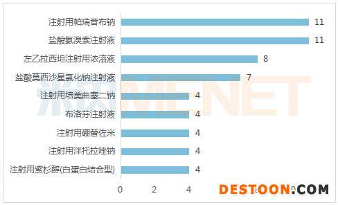 熱門過評品種中,鹽酸氨溴索注射液、注射用帕瑞昔布鈉均有11家企業(yè)過評;左乙拉西坦注射用濃溶液、鹽酸莫西沙星氯化鈉注射液分別有8家、7家企業(yè)過評。注射用紫杉醇(白蛋白結(jié)合型)、注射用泮托拉唑鈉、注射用培美曲塞二鈉、注射用硼替佐米及布洛芬注射液等5款注射劑均有4家企業(yè)過評。