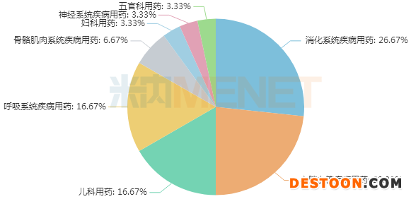 30個獨家中成藥涵蓋8個治療類別,消化系統(tǒng)疾病用藥以26.67%的占比(8個品種)排在首位,心腦血管疾病用藥以23.33%的占比(7個品種)緊接其后,兒科用藥、呼吸系統(tǒng)疾病用藥以16.67%的占比(5個品種)并列第三。
