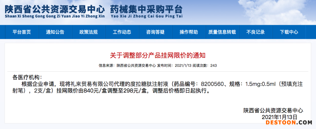 1月15日訊 1月13日,陜西省公共資源交易中心發(fā)布通知稱,根據(jù)企業(yè)申請,現(xiàn)將禮來度拉糖肽注射液(1.5mg:0.5ml 預(yù)填充注射筆,2支/盒)掛網(wǎng)限價(jià)由840元/盒調(diào)整至298元/盒,即每支149元。降幅超64.5%!