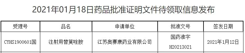 圖1:奧賽康的注射用替莫唑胺獲批信息