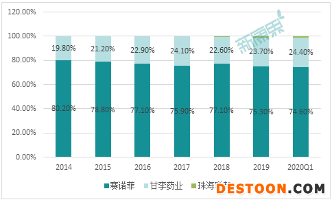 從近年市占率來看,原研份額下降明顯,國產(chǎn)替代正當其時。公司作為國內(nèi)最先實現(xiàn)規(guī)?;a(chǎn)甘精的藥企,市占率有望持續(xù)提升。截至2020年一季度,原研藥生產(chǎn)商賽諾菲在樣本醫(yī)院的市占率為74.6%,甘李占比24.4%。