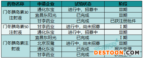 從門冬胰島素研發(fā)進展來看,甘李藥業(yè)、通化東寶、宜昌東陽光等藥企跑在前面。其中,甘李藥業(yè)已經(jīng)獲得門冬胰島素30注射液注冊批件,東陽光已經(jīng)完成三期試驗;通化東寶則在進行門冬胰島素50注射液三期試驗。