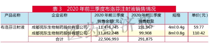 2020年前三季度,非甾體抗炎藥布洛芬各種劑型在樣本醫(yī)院的銷售額為7641萬元(骨骼與肌肉用藥的放大倍數(shù)為2.65,則放大至全國(guó)公立醫(yī)院購藥金額為7641萬元×2.65約為2.025億元,下同),布洛芬注射液2個(gè)規(guī)格的銷售額為2251萬元,約占29.46%,不到三分之一。