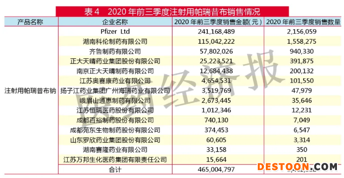 帕瑞昔布只有注射用劑型。2020年前三季度非甾體抗炎藥注射用帕瑞昔布2個(gè)規(guī)格在樣本醫(yī)院的銷售額為4.650億元,其中20mg規(guī)格為1.181億元,40mg規(guī)格為3.469億元。