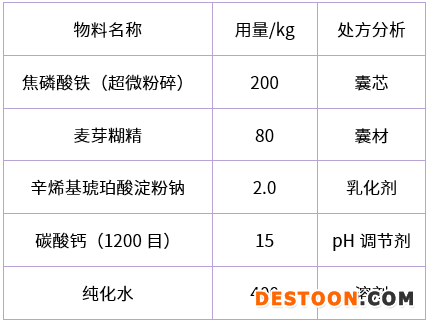 2.在2噸的配制罐中依次加入400kg純化水、200kg超微處理后的焦磷酸鐵原料、80Kg麥芽糊精、2.0Kg辛烯基琥珀酸淀粉鈉、15Kg碳酸鈣,2000轉(zhuǎn)/分進(jìn)行高速剪切60分鐘配制成混懸液;