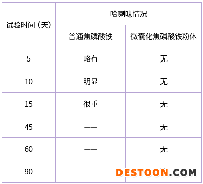 5.將普通的焦磷酸鐵與微囊化焦磷酸鐵粉體分別與豆粉按相同比例進(jìn)行混合,放在相同條件(恒溫恒濕箱內(nèi),設(shè)定溫度40℃,濕度70%)下,定期取樣。