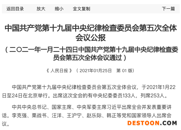1月25日,《人民日報(bào)》第01版刊登了《中國共產(chǎn)黨第十九屆中央紀(jì)律檢查委員會第五次全體會議公報(bào)》。